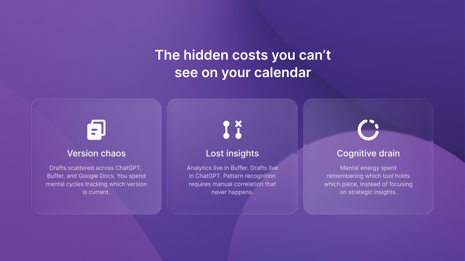 The constant copy-paste routine creates 12-18 context switches per post. You draft in ChatGPT. Then you copy the text into Buffer to schedule it. Then you paste the same content into Google Docs to track what you've published. Each tool switch costs 3-5 minutes of context reloading. What should be a 20-minute task becomes a 90-minute ordeal.